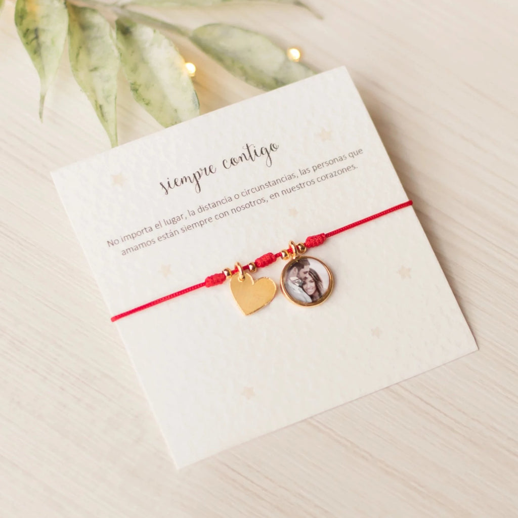 Pulsera de hilo rojo, con dije de fotografía personalizada y dije de corazón. Está elaborada de bronce con un baño de oro.